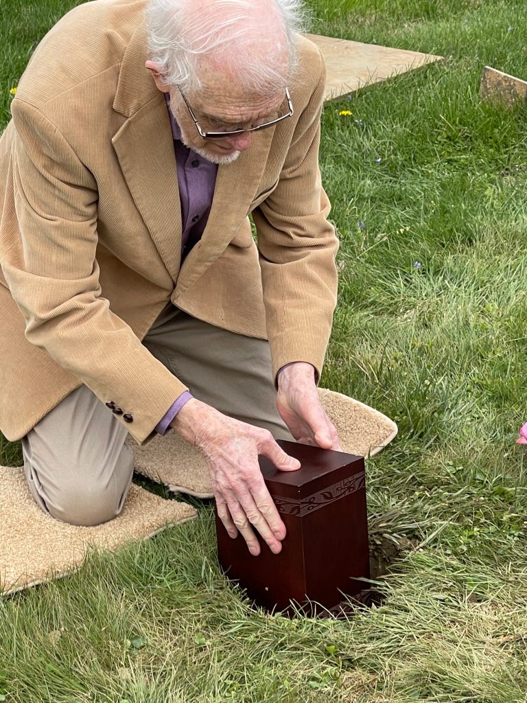 The service complete, I retrieve the urn and lead the way out to the graveyard. In this cemetery lie Barbara’s parents, grandparents and other relatives. Don Breneman, who mows the graveyard; says there are 2200 stones. I apologize for giving him another one to mow around. I lower the brown wooden urn into the ground. We pray, leave flowers, then depart.